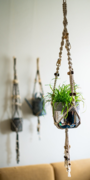 Ik zag ze vorig najaar ineens weer bij het tuincentrum: geknoopte plantenhangers! Dat deden we in de jaren ’70 ook: macramé-en. Allerlei knoopspullen in huis gehaald en ja hoor, het is net als fietsen, je verleert het niet! Inmiddels heb ik ook plantenhangers bedacht waar meerdere planten boven elkaar kunnen hangen. En ik hang ze ook buiten: kwestie van je materiaal aanpassen: i.p.v. katoen werk ik dan met sisal of jute. En inmiddels heb ik ook een enorme hanger gemaakt voor mijn fruitschaal.